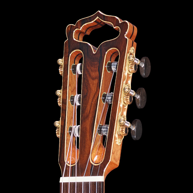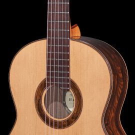 Der durchbrochene Palisander-Ahorn-Ziricote-Kopf und edle Design-Mechaniken vom Nicoló Alessi unterstreichen den hohen Qualitätsanspruch der HE TorresCeder. Optisch besticht diese Konzertgitarre mit einer Korpuslackierung aus UV-härtendem Hochglanzlack sowie einer Deckenlackierung in aufwändigster Schelllack-Handpolitur.