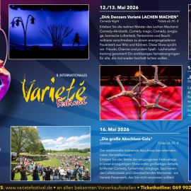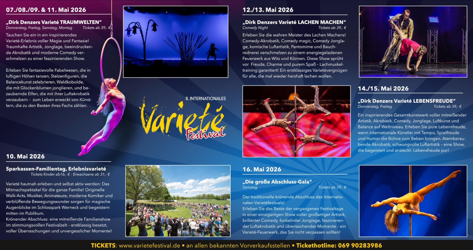 Glanzpunkte sind die poetische Eröffnungsshow „Traumwelten“, die neue Themenshow „Varieté Lebensfreude“, der interaktive Sparkassen-Familientag, die Comedy-Show „Varieté Lachen Machen“ und die festliche Abschluss-Gala.