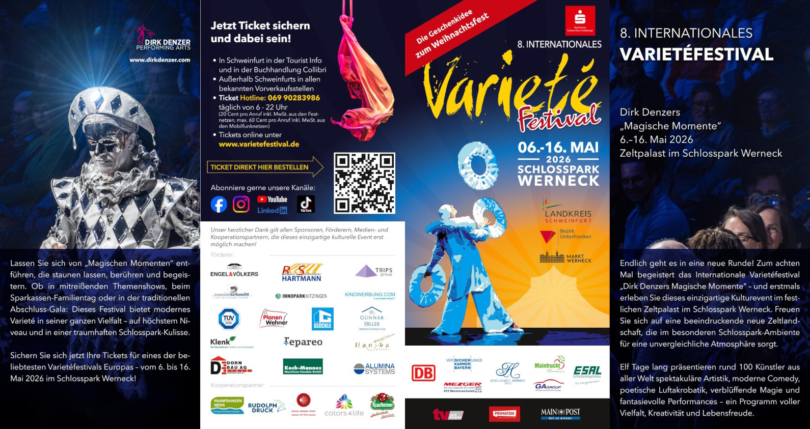 Lassen Sie sich von „Magischen Momenten“ verzaubern, die staunen lassen, berühren und begeistern. Sichern Sie sich jetzt Ihre Tickets für eines der beliebtesten Varietéfestivals Europas – vom 6. bis 16. Mai 2026 im Schlosspark Werneck!