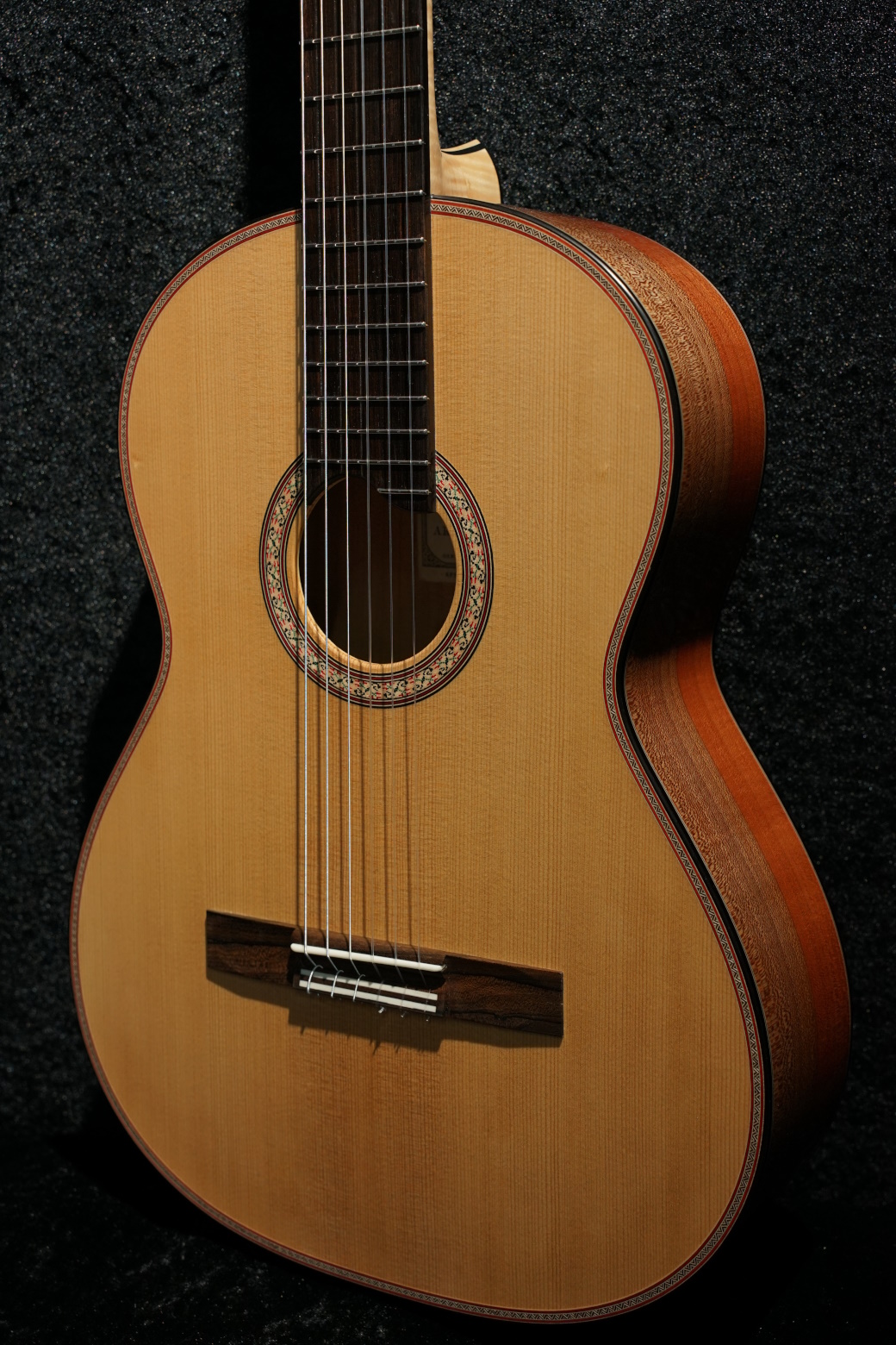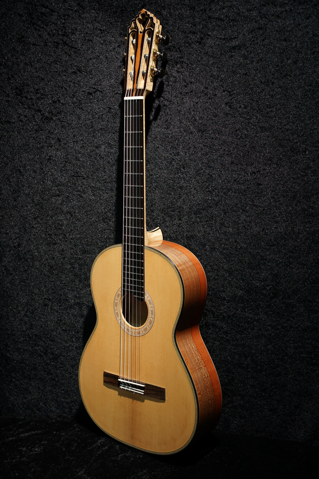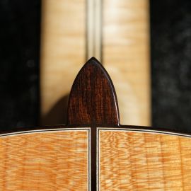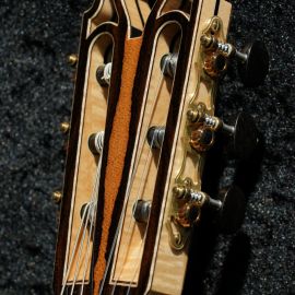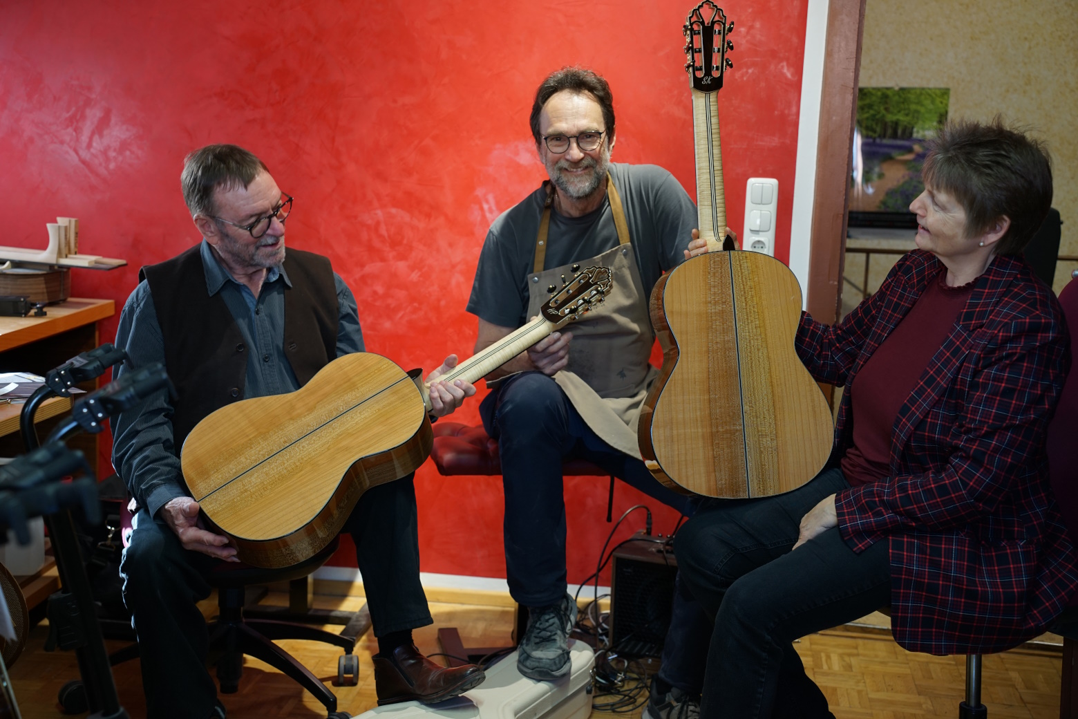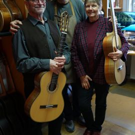 Als nun Ende März 2022 der geliebte Kirschbaum vor dem Haus von Harti und Sissi weichen musste, entstand die Idee, aus dem Holz dieses Baumes als Abschiedsgeschenk zwei Instrumente für die beiden nach ihren Vorstellungen zu bauen. Wir holten den Stamm ab, sägten Böden und Zargen daraus und jetzt, nach einigen Jahren Trocknungszeit, war es soweit. Die beiden individuellen Konzertgitarren auf Basis der Natural-Torres konnten von Armin Hanika übergeben werden und wurden mit großer Freude sofort ausgiebig getestet.