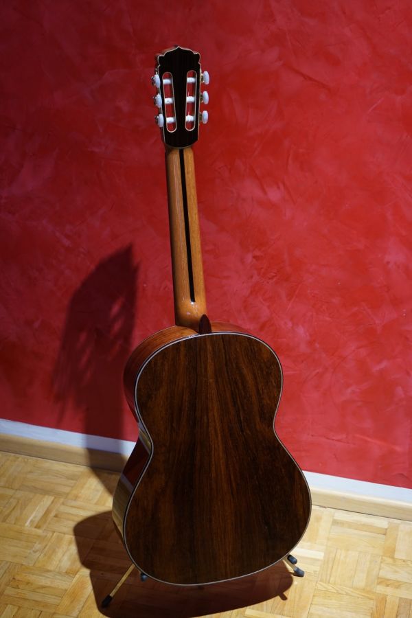 Since our recital line stock of PaloEscrito (Dalbergia PaloEscrito) is now used up and installed, we have decided to use since the start of construction in January 2019 in these models for back and sides the lively and warmer-sounding Madagascar rosewood (Dalbergia baronii).